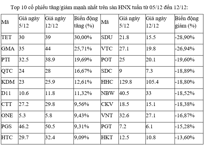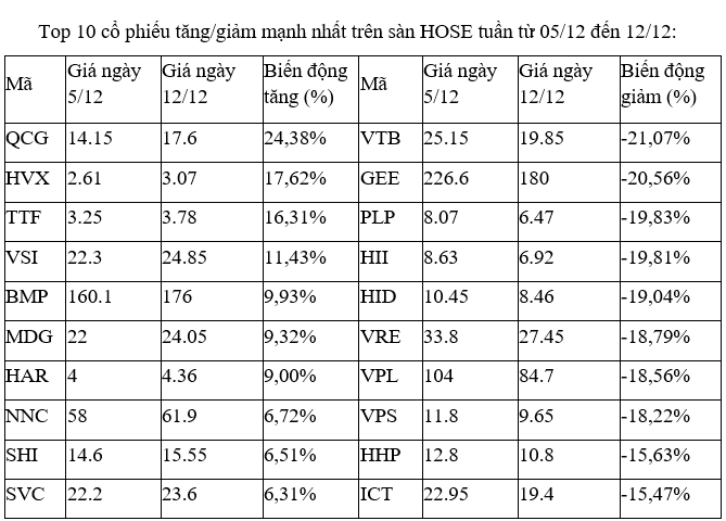 Ở chiều ngược lại, các cổ phiếu nhỏ VTB, HID, HII, GEE, VPS đều đã bị chốt lời sau khi góp mặt trong top tăng cao nhất vào tuần trước (28/11 đến 05/12), với mức tăng của VPS, VTB và HID trên dưới 30%.