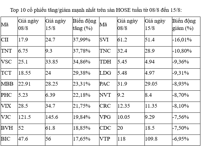Trên sàn HOSE, cổ phiếu CII thêm một tuần là quán quân tăng giá, thậm chí mức tăng còn cao hơn tuần trước đó (tuần trước CII tăng gần 24%). Tổng cộng, cổ phiếu này đã ghi nhận chuỗi 11 phiên tăng liên tiếp, đưa giá cổ phiếu lên mức cao nhất trong hơn 3 năm qua.