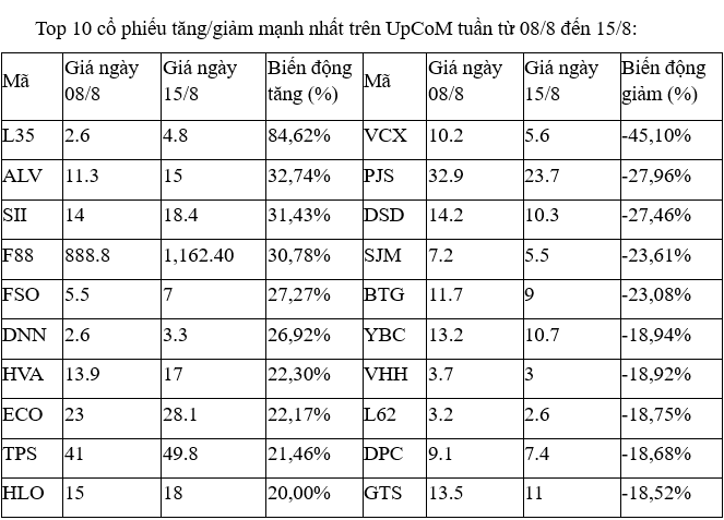 Trên UpCoM, thêm một tuần mà phần lớn các cổ phiếu biến động tăng, giảm mạnh nhất đều duy trì thanh khoản thấp, hoặc trồi sụt trong các phiên. Ngay cả tân binh gần đây là F88 cũng chỉ vài chục nghìn đơn vị khớp lệnh/phiên.