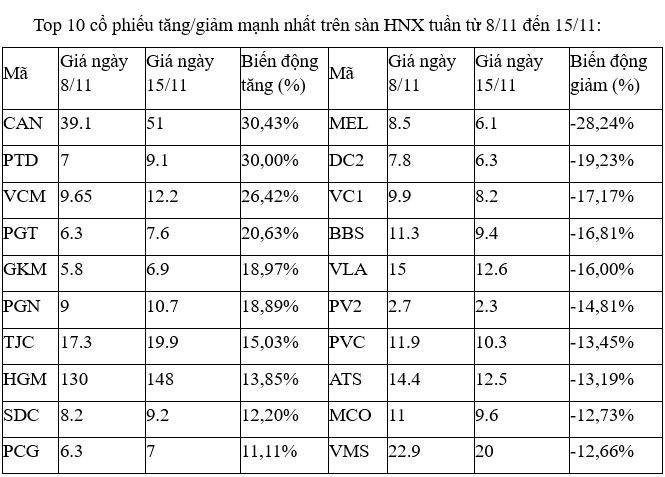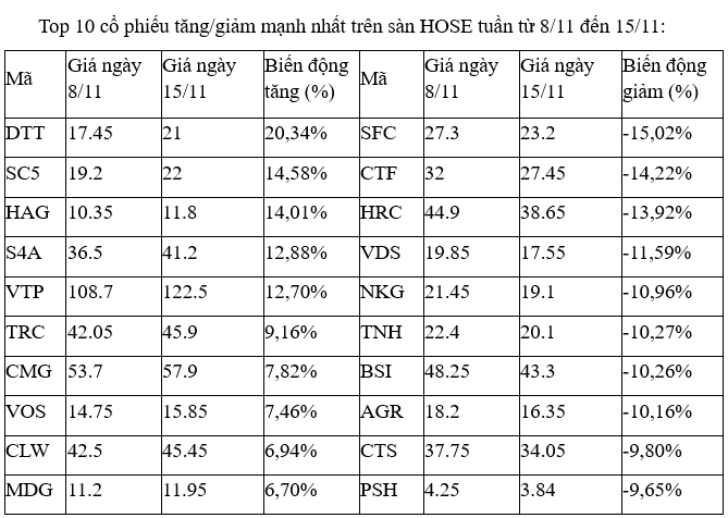 Đáng chú ý là sự xuất hiện của VTP, khi có tuần thứ hai liên tiếp lọt vào top những mã tăng cao nhất sàn với điểm nhấn trong hai phiên ngày 12 và 15/11 khi đều tăng kịch trần. Tuần trước cổ phiếu này tăng hơn 22%.