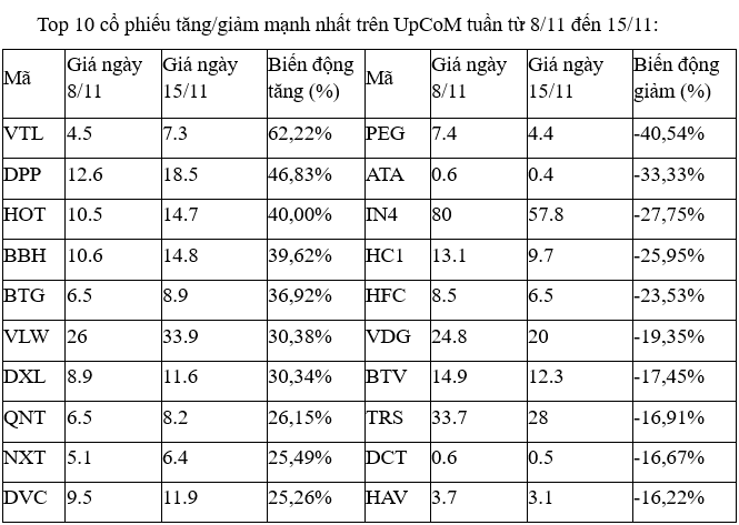 Trên UpCoM, các cổ phiếu biến động mạnh nhất tuần này vẫn thiếu điểm nhấn, khi thanh khoản khớp lệnh trong các phiên giao dịch chỉ dừng lại ở mức rất thấp.