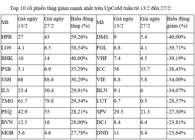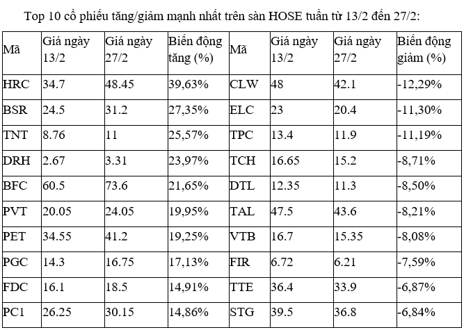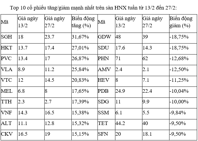 Trên sàn HNX, cổ phiếu nhóm dầu khí là PVC của Tổng CTCP Hóa chất và Dịch vụ Dầu khí nổi trội khi tăng mạnh và giao dịch sôi động, với phiên 27/2 khớp lệnh tới gần 11 triệu đơn vị, mức cao nhất từ nhiều năm nay.