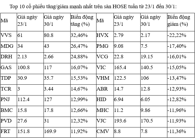 Ở chiều ngược lại, cổ phiếu VMS biến động giật cục, khi liên tiếp có những phiên tăng trần, rồi giảm sàn sau đó từ phiên 22/1. Tuần trước, cổ phiếu này là mã tăng cao nhất sàn với mức tăng hơn 31%.