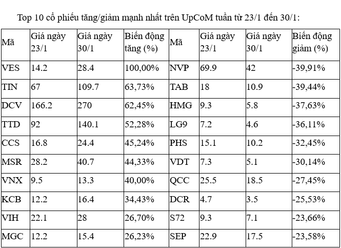 Trên UpCoM, cổ phiếu VES dẫn đầu đà tăng, sau khi tăng hơn 31% trong tuần trước thì đã tăng gấp đôi trong tuần. Tổng cộng, cổ phiếu VES đã ghi nhận 8 phiên liên tiếp tăng kịch trần gần nhất, nhưng thanh khoản thấp, chỉ vài nghìn đơn vị khớp lệnh phiên.
