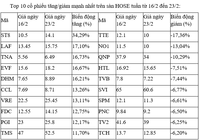 Các cổ phiếu tăng mạnh khác phần lớn cũng là những cổ phiếu có thị giá vừa và nhỏ, với thanh khoản thấp như LAF, DHM, FDC, PGI, TMS.