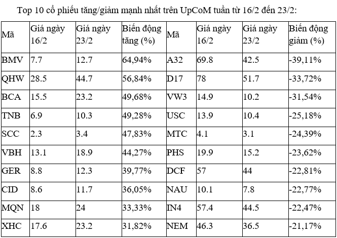Trên UpCoM, đa phần các cổ phiếu tăng, giảm mạnh nhất tuần này đều giao dịch thưa thớt, ngoại trừ BCA, với trung bình trên dưới 0,3 triệu đơn vị khớp lệnh/phiên.