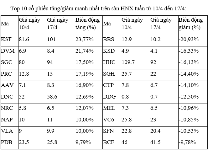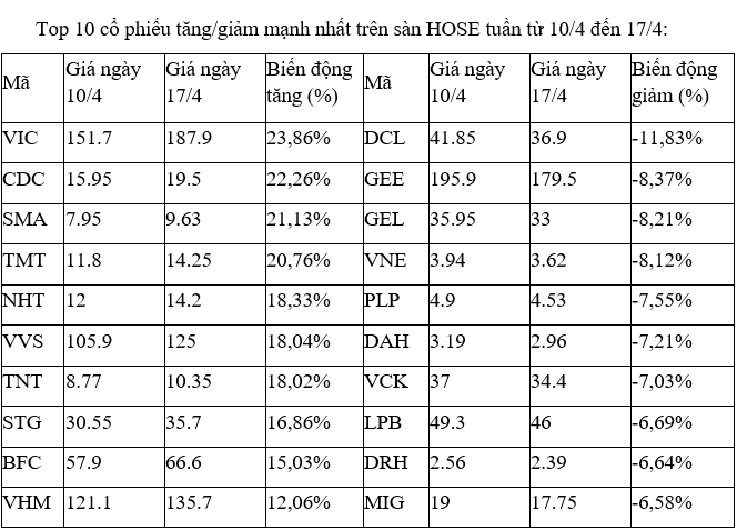 Trên sàn HOSE, cổ phiếu VIC dẫn đầu với mức tăng gần 25% và góp phần không nhỏ vào mức tăng của VN-Index trong tuần qua, trong đó, có hai phiên 15 và 16/4 cổ phiếu này tăng kịch trần.
