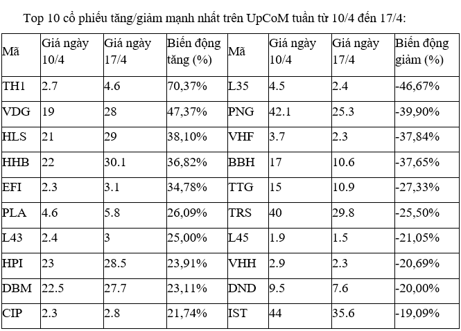 Trên UpCoM, thêm một tuần mà các cổ phiếu biến động mạnh nhất đều giao dịch khá ảm đạm, thanh khoản thấp. Cao nhất là cổ phiếu EIF cũng chỉ có vài chục nghìn đơn vị khớp lệnh/phiên.