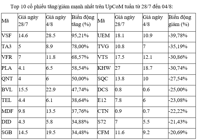 Trên UpCoM, cổ phiếu ngành lương thực VSF với 8 phiên gần nhất đều tăng kịch trần, thanh khoản cũng được cải thiện đáng kể.