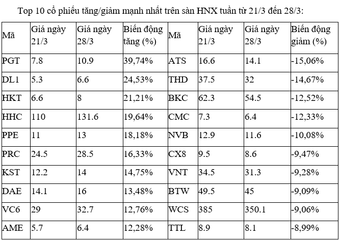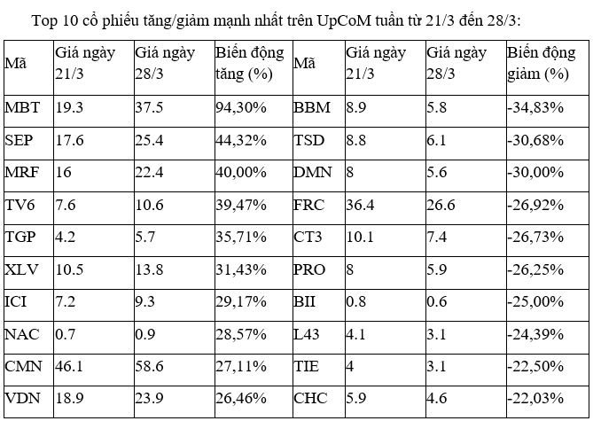 Trên UpCoM, tuần giao dịch ảm đạm, khi các cổ phiếu tăng, giảm mạnh nhất đều giao dịch thưa thớt.