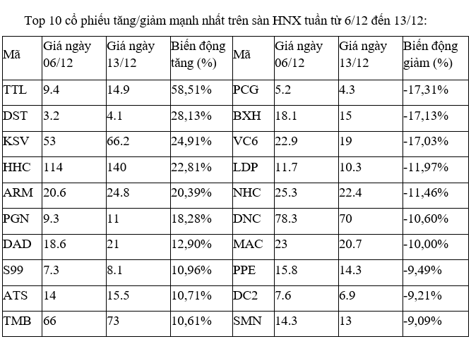 Trên sàn HNX, cổ phiếu TTL tăng vọt và bỏ xa phần còn lại với cả năm phiên đều tăng kịch trần, nhưng thanh khoản thấp với chỉ trên dưới 5.000 đơn vị khớp lệnh, ngoại trừ phiên cuối tuần khi đột biến có hơn 250.000 cổ phiếu được sang tay.