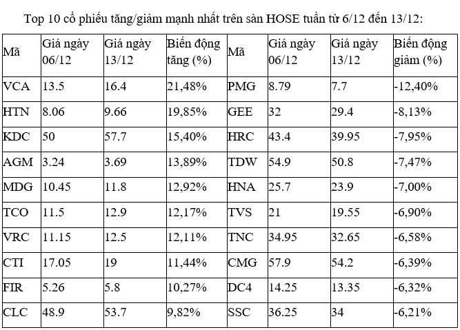 Trên sàn HOSE, cổ phiếu VCA của CTCP Thép Vicasa – Vnsteel có thêm một tuần dẫn đầu trong số các mã tăng mạnh nhất. Tổng cộng mã này đã ghi nhận 11 phiên tăng trần liên tiếp kể từ phiên 28/11 đến 12/12, nhưng đã chịu lực bán chốt lời trong phiên cuối tuần 13/12 khi giảm sàn, khớp lệnh hơn 0,34 triệu đơn vị. Tuần trước, cổ phiếu này tăng gần 40%.