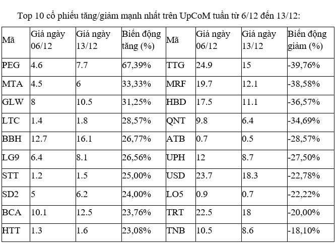 Trên UpCoM, đa phần các mã tăng, giảm mạnh nhất đều thanh khoản thấp. Ngoại trừ cổ phiếu MTA, khớp lệnh bất ngờ phiên cuối tuần hơn 0,29 triệu đơn vị, trong khi các phiên còn lại chỉ 30.000-40.000 đơn vị khớp lệnh.