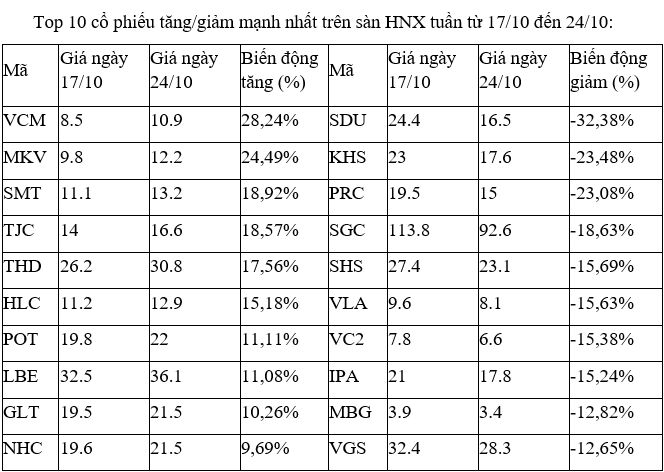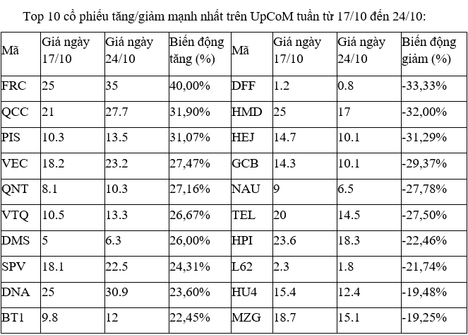 Trên UpCoM, hầu như các cổ phiếu biến động mạnh nhất về giá tiếp tục có tuần giao dịch ảm đạm. Ngoại trừ hai cổ phiếu VEC ở chiều tăng và DFF ở chiều giảm khi có những phiên thanh khoản tương đối cao.