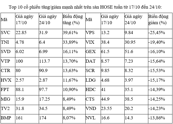Trên sàn HOSE, cổ phiếu SVC vượt trội khi tăng gần 40% sau khi đã có nhịp tăng hơn 11% trong tuần trước đó. Tuy nhiên, thanh khoản của cổ phiếu này chỉ dừng lại ở mức thấp, trung bình chỉ vài chục nghìn đơn vị/phiên.