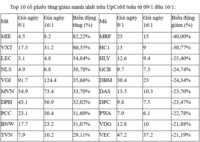 Trên UpCoM, cổ phiếu VXT, VGI có tuần thứ hai liên tiếp tăng mạnh, dù chỉ VGI có thanh khoản là đáng kể trong các phiên giao dịch.