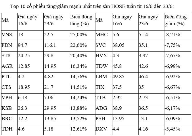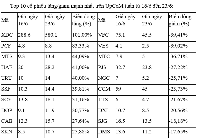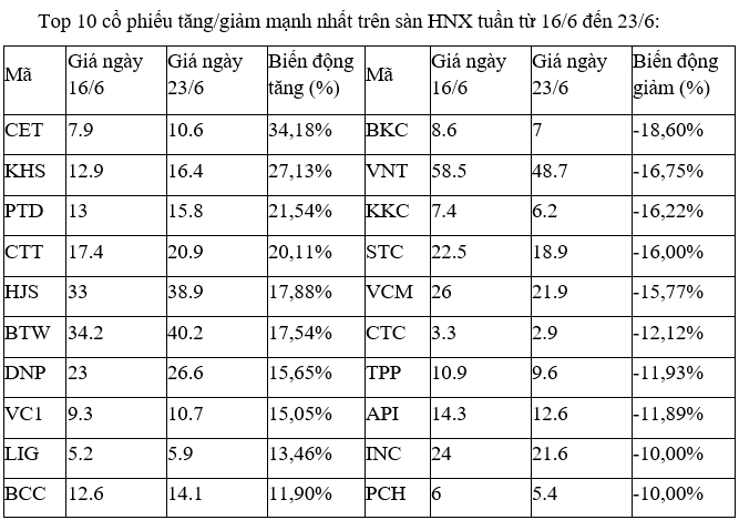 Trên sàn HNX, cổ phiếu CET có tuần khởi sắc nhất, với chỉ một phiên giảm và bốn phiên tăng mạnh, trong đó, có hai phiên tăng kịch trần ngày 21 và 22/6. Thanh khoản cũng được cải thiện đáng kể với trung bình hơn 125.000 đơn vị.