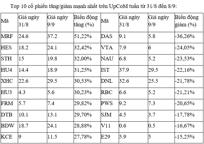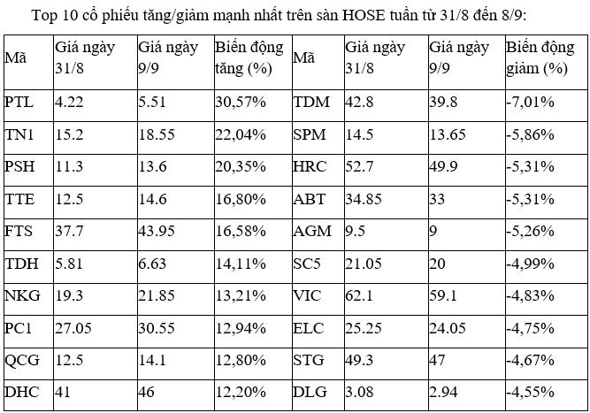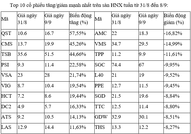 Đáng chú ý là QCG, khi có tuần thứ hai liên tiếp lọt vào top những mã tăng mạnh nhất, sau khi tuần trước +19%. Dù vậy, áp lực bán chốt lời cũng đã xuất hiện khi trong phiên cuối tuần 8/9, cổ phiếu này đã giảm sàn.