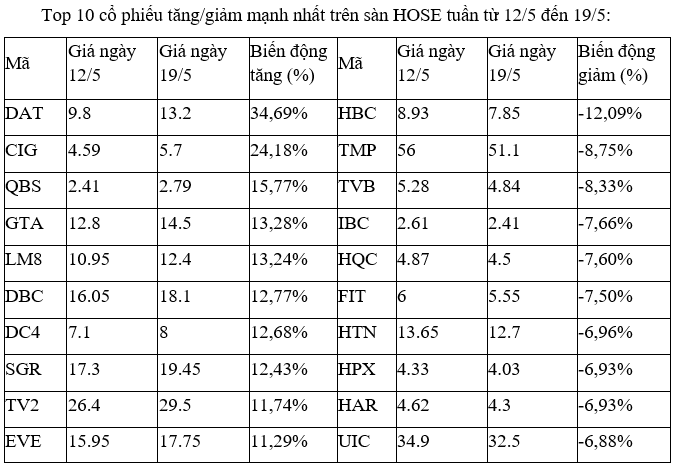 Trên sàn HOSE, nhóm cổ phiếu tăng mạnh nhất vẫn chiếm phần lớn là các cổ phiếu vừa và nhỏ, với giao dịch tương đối sôi động trong các phiên có thể kể đến QBS, DBC, TV2 và EVE. Trong đó, QBS có tuần thứ hai lọt vào top các cổ phiếu dẫn đầu sau khi tuần trước là cổ phiếu tăng mạnh nhất khi +30,3%.