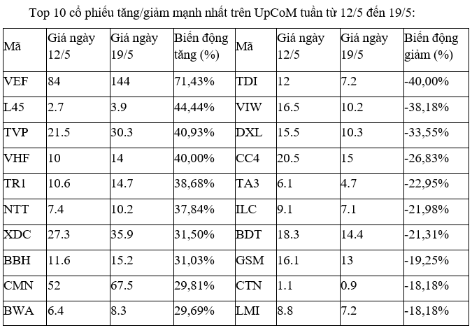 Trên UpCoM, cổ phiếu VEF của CTCP Trung tâm Hội chợ Triển lãm Việt Nam bất ngờ có tuần khởi sắc, với 4 trên 5 phiên tăng kịch trần. Tổng cộng 20 phiên gần nhất, cổ phiếu này đã có 18 phiên tăng. Thanh khoản gần đây tăng khá, dù chỉ vài chục nghìn đơn vị khớp lệnh/phiên.