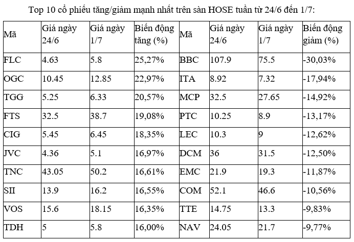 Trên sàn HOSE, nhóm cổ phiếu tăng mạnh nhất gần như đều là các mã cổ phiếu vừa và nhỏ, có tính đầu cơ cao với những cái tên quen thuộc như FLC, OGC, TGG, JVC, VOS, CIG, TDH…