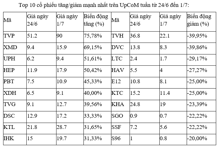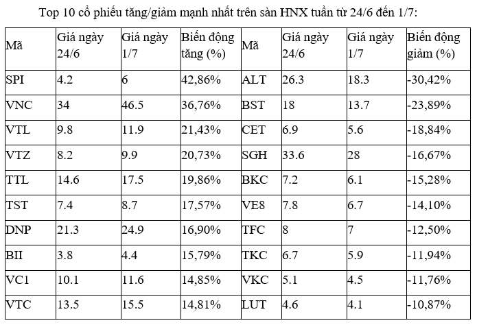 Trên sàn HNX, nhóm cổ phiếu tăng, giảm mạnh nhất đa số đều là các cổ phiếu vừa và nhỏ, dù vậy, ngoài BII ở các mã tăng cao và VKC ở nhóm giảm sâu có giao dịch tương đối sôi động trong các phiên, còn các cổ phiếu còn lại đều chỉ có thanh khoản thấp.