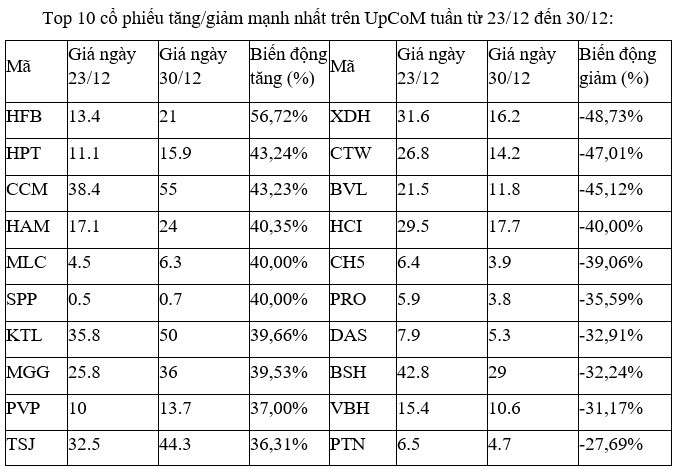 Trên UpCoM, cổ phiếu HFB của Công trình Cầu phà TP.HCM có tuần thứ hai liên tiếp là cổ phiếu tăng mạnh nhất, sau khi tuần trước tăng gần 72%. Dù vậy, giao dịch trong phiên của cổ phiếu này không đáng kể, thậm chí có phiên còn trắng thanh khoản.
