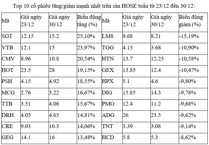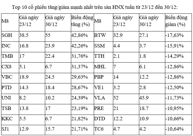 Trên sàn HNX, nhóm các cổ phiếu tăng, giảm mạnh nhất tuần này không có nhiều điểm đáng chú ý, khi phần lớn chỉ giao dịch trên nền thanh khoản thấp.