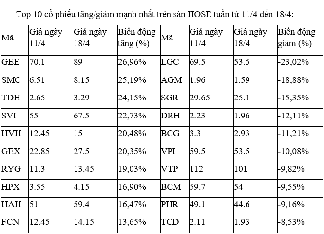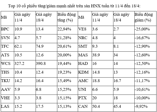 Trên sàn HNX, gần như các cổ phiếu tăng, giảm mạnh nhất tuần này không nhiều diễn biến đáng chú ý nào, khi đa số giao dịch với khối lượng mỏng trong các phiên.