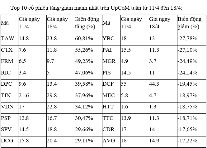 Trên UpCoM, các cổ phiếu biến động mạnh nhất tuần này đều giao dịch thưa thớt, thanh khoản kém, không có diễn biến đáng kể nào trong các phiên.