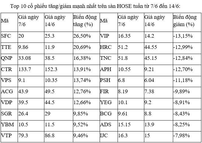 Đáng chú ý là sự xuất hiện của hai cổ phiếu nhà Viettel CTR và VTP khi có tuần khởi sắc, trong đó, CTR bứt phá mạnh mẽ trong hai phiên ngày 13 và 14/6 với mức tăng gần 7% mỗi phiên.