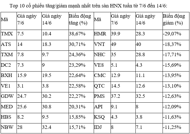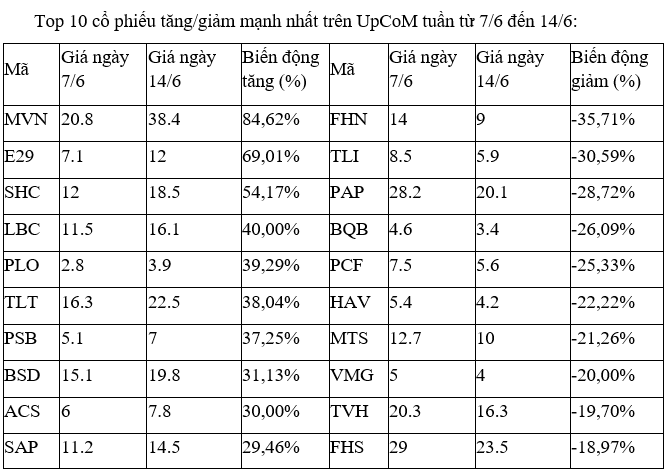 Trên UpCoM, các cổ phiếu tăng, giảm mạnh nhất tuần qua đa phần là các mã thị giá nhỏ. Đồng thời, thanh khoản cũng không cổ phiếu nào nổi trội khi đa số chỉ vài chục nghìn đơn vị khớp lệnh/phiên.