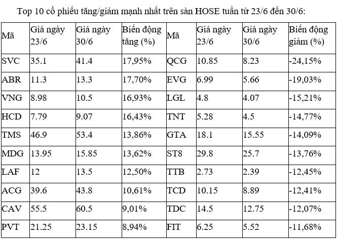 Trên sàn HOSE, nhóm cổ phiếu tăng mạnh nhất tuần này có biên độ tăng thấp hơn nhiều so với những tuần trước đó, phản ánh sự thận trọng và phần nào áp lực chốt lời gia tăng.