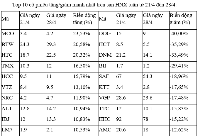 Chỉ số HNX-Index tăng 0,56 điểm (+0,27%), lên 207,48 điểm. Giá trị giao dịch trên HNX giảm 8% so với tuần trước xuống 5.082 tỷ đồng.