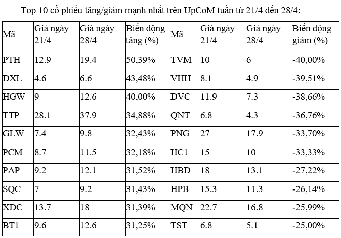 Tuần này, các cổ phiếu tăng, giảm mạnh nhất trên UpCoM không có diễn biến nào đáng chú ý, khi vẫn là những mã chỉ có thanh khoản thấp, thậm chí còn có những phiên trắng giao dịch.