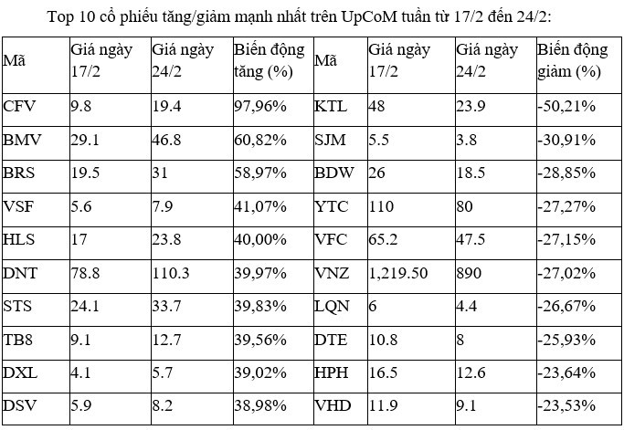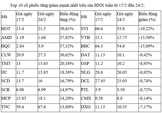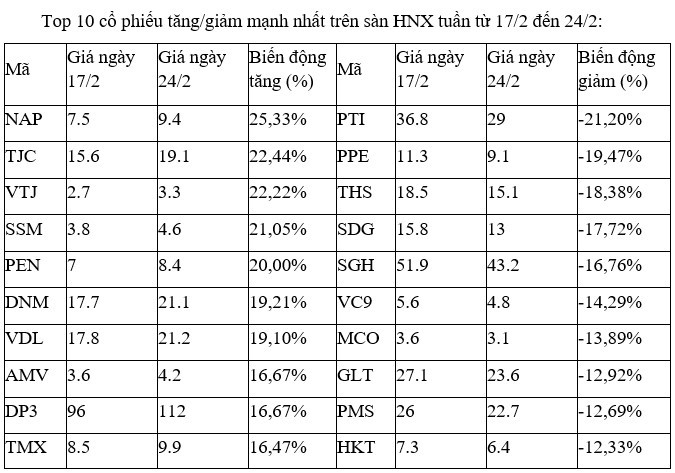 Trên sàn HNX, nhóm cổ phiếu tăng, giảm mạnh nhất tuần này không có điểm nhấn đáng kể nào, khi đều là những mã có thanh khoản thấp trong các phiên.