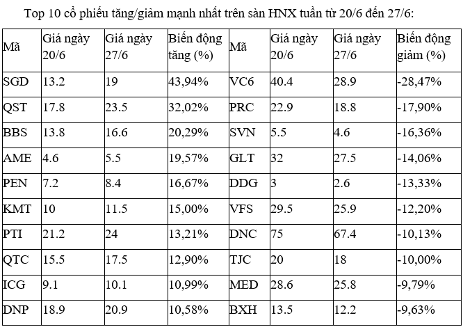 Trên sàn HNX, diễn biến ở nhóm các cổ phiếu tăng, giảm mạnh nhất khá buồn tẻ khi thanh khoản khớp lệnh trong các phiên ở mức thấp. Ngoại trừ hai cái tên ở chiều hướng giảm là SVN và VFS.