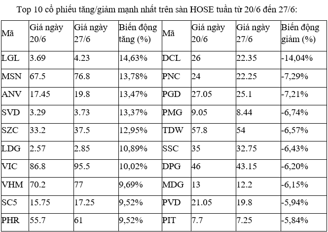 Ở chiều ngược lại, nhà đầu tư tiếp tục có thêm một tuần tiết cung giá thấp, khi hầu hết các mã giảm mạnh nhất cũng chỉ trên dưới 6% đôi chút. Ngoại trừ DCL, khi chịu sức ép lớn ở phiên cuối tuần (giảm sàn) và khiến cổ phiếu này giảm sâu.