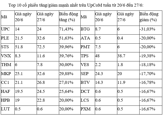 Trên UpCoM, tuần giao dịch khá ảm đạm, ít điểm nhấn khi thanh khoản thấp trong các phiên ở top những mã biến động lớn nhất về giá.
