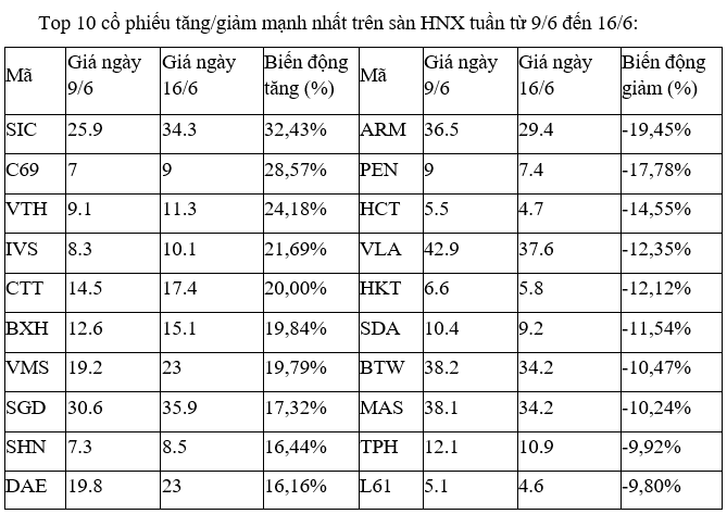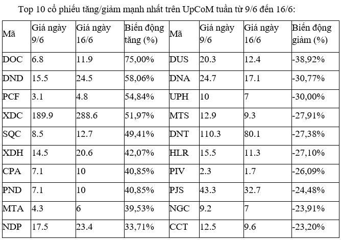 Trên UpCoM, tuần này các cổ phiếu tăng, giảm mạnh nhất đều ít có diễn biến đáng kể nào khi thanh khoản duy trì ở mức thấp.