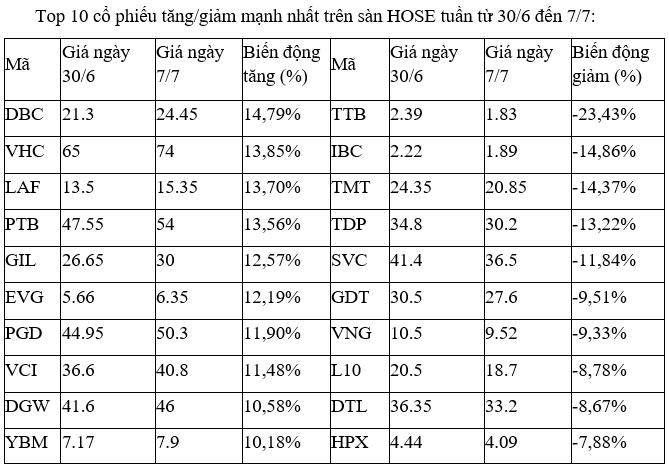 Một số cổ phiếu đáng chú ý là tại nhóm nông nghiệp, thủy sản như DBC, VHC, LAF, với mức tăng trên dưới 14%.