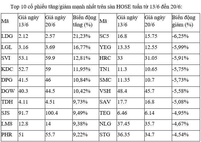 Trên sàn HOSE, các cổ phiếu tăng mạnh nhất với điểm nhấn là tại nhóm cổ phiếu bất động sản, xây dựng với một số mã như LDG, LGL, TDH, SJS, DPG và tay chơi mới gia nhập ngành là KDC. Tuy nhiên, chỉ LDG và LGL, hai mã nhỏ có tính đầu cơ cao có mức tăng vượt trội, còn lại tăng trên dưới 10%.