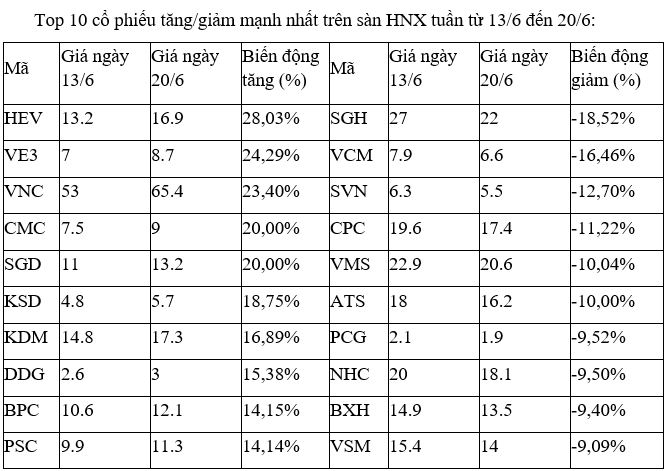 Trên sàn HNX, nhóm các cổ phiếu tăng, giảm mạnh nhất tuần này đa số là các cổ phiếu vừa và nhỏ, có thị giá thấp, thanh khoản cũng chỉ ở mức thấp và trồi sụt.