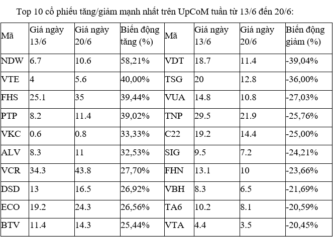 Tuần này, UpCoM chào đón tân binh TRV của CTCP Vận tải Đường sắt với phiên giao dịch đầu tiên vào ngày 19/6, giá tham chiếu 10.000 đồng đã tăng kịch trần liên tiếp trong hai phiên, đưa giá cổ phiếu kết thúc tuần lên 16.100 đồng, khớp lệnh lần lượt 2 phiên là 39.900 và 1.800 đơn vị.