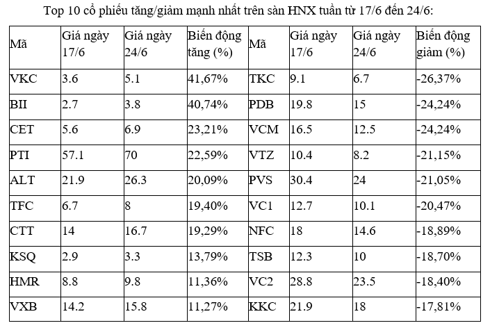 HNX-Index giảm 4,13 điểm (-4,3%), xuống 275,93 điểm. Giá trị giao dịch trên HNX giảm 44,9% so với tuần trước xuống 7.115 tỷ đồng, khối lượng giao dịch giảm 33,4% xuống 335 triệu cổ phiếu.