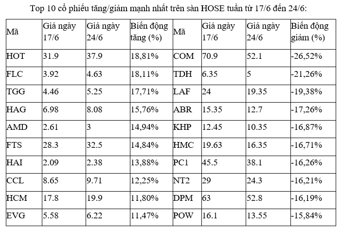 Trên sàn HOSE, nhóm cổ phiếu tăng cao nhất đáng chú ý có họ FLC khi đóng góp tới ba cái tên là FLC, AMD và HAI, trong khi phần còn lại cũng đa số là các cổ phiếu thị trường có tính đầu cơ cao như HAG, EVG, HAG, CCL.
