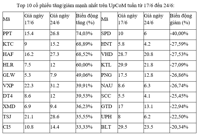Trên UpCoM, cổ phiếu tân binh PPT của Công ty cổ phần Petro Times có phiên giao dịch đầu tiên vào ngày 17/6, với giá tham chiếu 11.000 đồng, đã có 6 phiên tăng, trong đó, 4 phiên tăng kịch trần từ 17/6 đến 22/6, hai phiên còn lại lần lượt tăng 11,6% và 2,7%.
