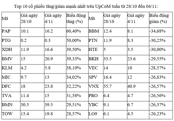 Trên UpCoM, các cổ phiếu biến động mạnh nhất tuần này cũng không có nhiều điểm đáng chú ý nào, khi khối lượng giao dịch trong phiên đều chỉ ở mức thấp.