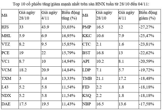 Trên sàn HNX, nhóm cổ phiếu tăng, giảm mạnh nhất sàn giao dịch khá ảm đạm, ngoại trừ một vài cổ phiếu như NDX ở phía tăng và CTC, API, KSQ, FID có giao dịch vài chục nghìn đến vài trăm nghìn đơn vị khớp lệnh trong phiên.