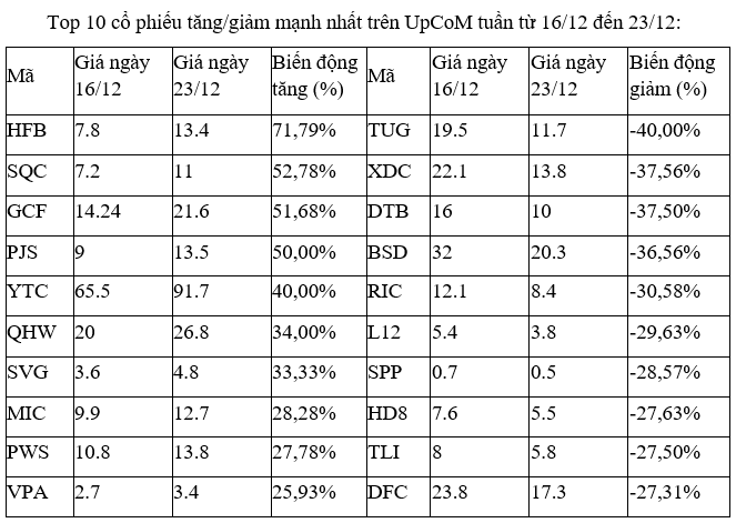 Tuần này, UpCoM chào đón tân binh GCF của CTCP Thực phẩm G.C vào phiên 20/12 với 26 triệu cổ phiếu giao dịch, giá tham chiếu 12.000 đồng/cổ phiếu và cổ phiếu này đã liên tiếp có bốn phiên tăng kịch trần lên 21.600 đồng, thanh khoản vài chục nghìn đơn vị khớp lệnh/phiên.